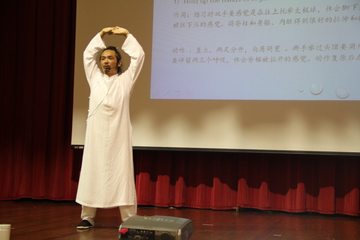 随后, 陈师宇老师应新加坡杨厝港民众俱乐部太极学会邀请,为拳友们进行太极养生讲座。讲座内容丰富。从武当太极拳的阴阳理论,以及文化内涵到太极养生的价值等作了详细的概述。他讲到习拳的时候,思想需要进入一种毫无杂念的状态,求得自然天人合一的境界;他亲自示范了太极拳的阴阳、虚实、中正,刚柔的拳法,拳理,以及妙用。