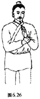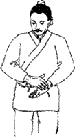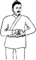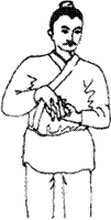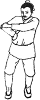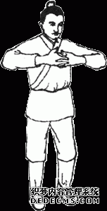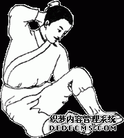 图6.4 向左右摇头十四次。 图6.5 一手抱头,一手托膝弯成三折状,左右相同。 图6.6 两手托头向上三次。 图6.7 一手托住头项,一手托住膝外侧,并由下向上扳三次,左右相同。 图6.8 两手扳头向下俯三次,然后顿足。 图6.9 两手相捉,一手引另一手从头上过,左右各三次。 图6.10 两手相叉,掌心向胸,收回;然后反转向胸,连收回三次。 图6.11 右手曲腕,捶肋,左手挽引右肘,两手交换动作,各做三次。 图6.12 两手先由左右两侧往中间挽引,然后由前后往身体拔牵,各做三次。 图6.13 伸开手指,挽引头项(颈部),向左、右侧各三遍。 图6.14 翻转左手,掌心按右膝上;右手挽引左肘,然后按在左手上,两手相叠。左右交换动作,各做三次。(反手着膝手挽肘复手着膝上左右亦三遍) 图6.15 左手向上而下按摸右肩,左右相同。 图6.16 两手握虚拳,向前捶击出三次。(两手空拳筑三遍) 图6.17 两手掌心向外振动三次,向内振动三次,向下振亦三次。 图6.18 两手相叉,来回搅动腕关节,左右各七次。[[18]] 图6.19 磨擦、扭动十指三次。 图6.20 两手翻掌,正反摇动三遍。 图6.21 两手反叉上下扭时无数单用十呼。亦即两手反叉,上下运动使两肘扭动,做无数次。单独练习,做十次呼吸的时间即可。 图6.22 两手相叉,向上耸伸三次,向下顿接三次。 图6.23 两手相手叉头上过,向左右分别牵引伸肋十次。 图6.24 两手握拳,反捶脊背上下各三次。 图6.25 两手反背上相捉,上下往来推脊三遍。 图6.26 手掌按搦腕内,向外振动三次。 图6.27 两掌向前推三次。(覆掌前耸三遍) 图6.28 掌心向下,两手相交叉成横位,向下按三次。(覆掌两手相叉交横三遍) 图6.29 两手掌心向下,横向对直,向上耸举三次。如有手患冷病,可以从上到下拍打身体,手得热,病便除。(复手横直即耸三遍,若有手患冷从上打至下得热便休) 图6.30 舒左脚右手承之,左手捺脚从上至下直脚三遍,右手捺脚亦同。亦即伸左脚,右手托在左膝弯,左手从上而下推捺下肢,三次。右手推脚,也如此。 图6.31 前后捩足三遍,左捩足,右捩足,各三遍,前后脚捩足三遍。亦即站立,向前、向后、向左、向右扭转足踝关节各三次,前后反向扭足三次。 图6.32 直脚三遍,扭髀三遍,内外振动三遍,若有脚患冷者,打热便休。扭髀以意多少顿脚三遍却直脚三遍。亦即伸脚三次,转动髋关节三次,向内外转动足踝各三次。如有脚冷者,用手打热便除。扭动关节时,用意注之。顿脚三次,再伸脚三次。 图6.33 如虎踞地,头向左右肩回顾,各三次。(左右扭肩三次) 图6.34 一手托天,一手按地,左右交替,各做三次。(推天托地左右在遍) 图6.35 两手向左右如排山一样外推,做三次。背如负山,两手如拔树一样牵引三次。(左右排山负山拔木各三遍)