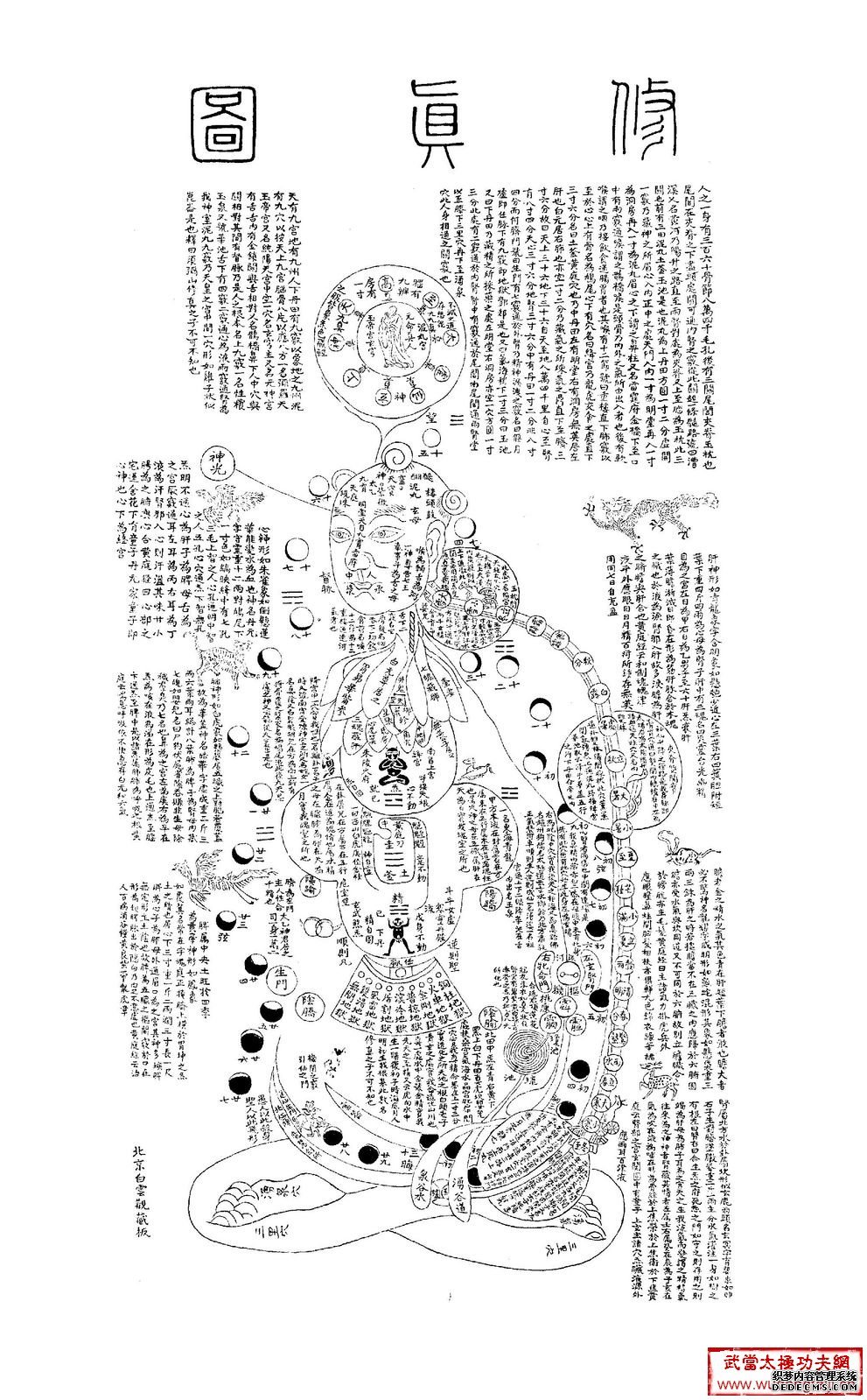 《修真图》是由卷首、中轴柱体和两翼图文三大部分组成。